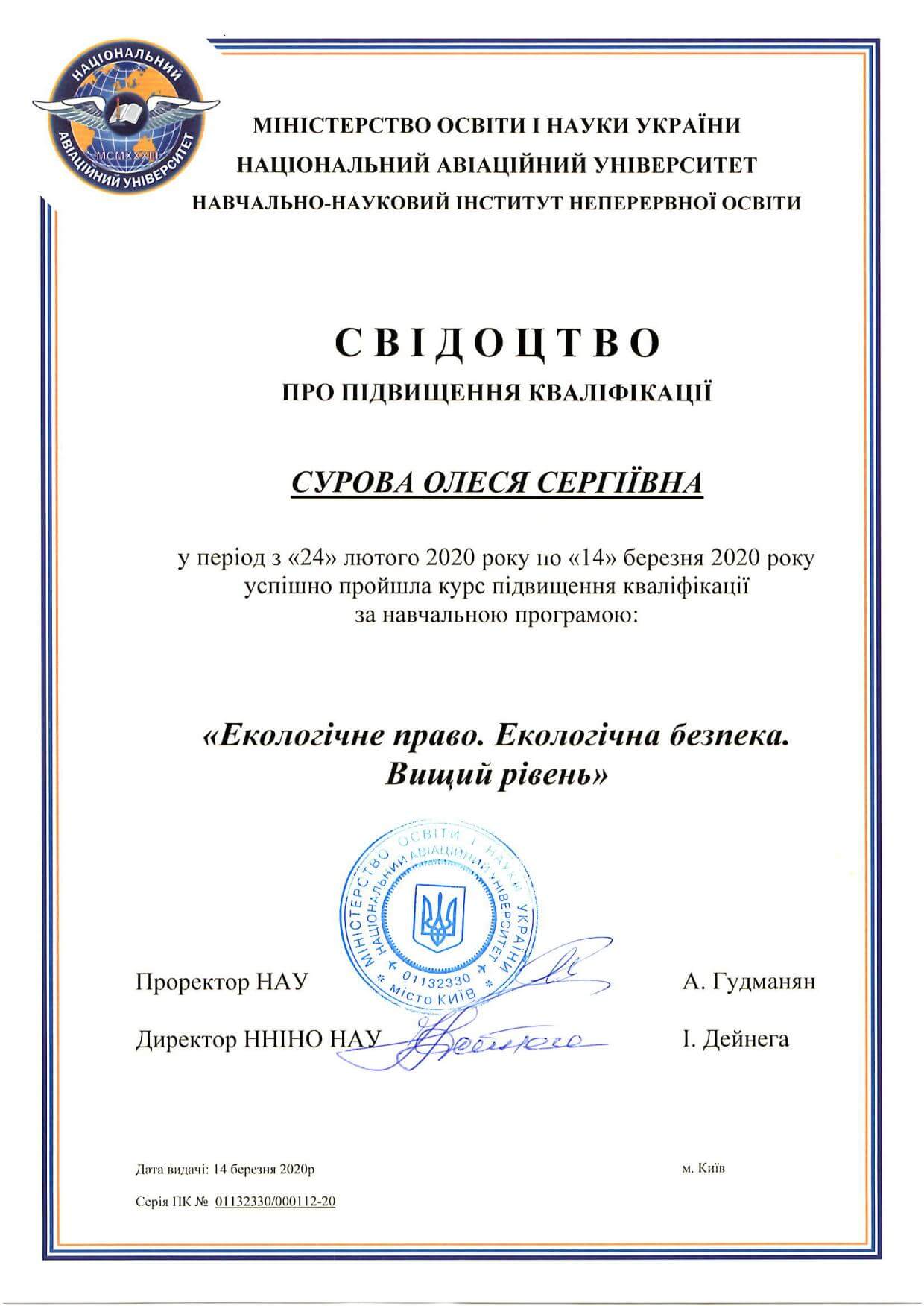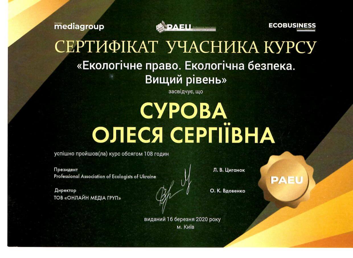 Навчання відбувалося дистанційно з 24 лютого 2020 року – 14 березня 2020 року. В результаті отримала необхідні знання для реалізації їх, зокрема, у проєктах містобудівної документації.